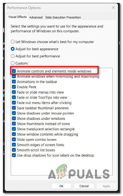 في Windows 10 و Windows 11، ستجد هذه الميزة متخفية تحت اسم ‘Animate controls and element inside windows‘ داخل قائمة Performance Options.