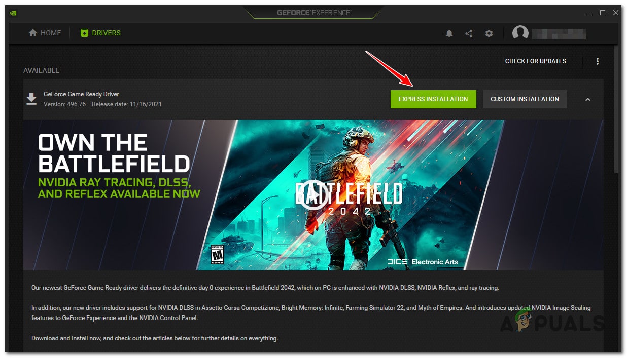 ملاحظة: يمكنك أتمتة هذه العملية باستخدام Nvidia Experience والسماح للبرنامج باختيار برنامج التشغيل المناسب لطراز GPU الخاص بك. - بمجرد تنزيل ملف برنامج التشغيل التنفيذي المطلوب محليًا، قم بتشغيله كمسؤول واتبع التعليمات التي تظهر على الشاشة لإنهاء تثبيت برنامج التشغيل.
