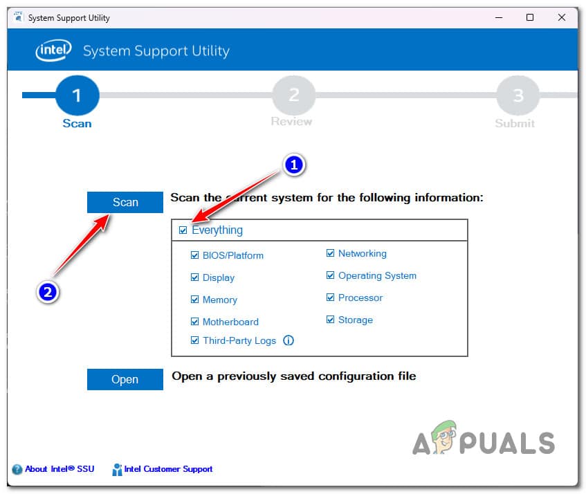 - عند المطالبة الأولى لأداة دعم النظام، حدد كل شيء، ثم انقر على زر فحص.