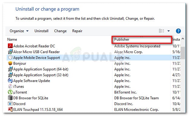 - بمجرد وصولك إلى قائمة البرامج والميزات، انقر على عمود الناشر لترتيب جميع البرامج المثبتة بشكل مناسب.