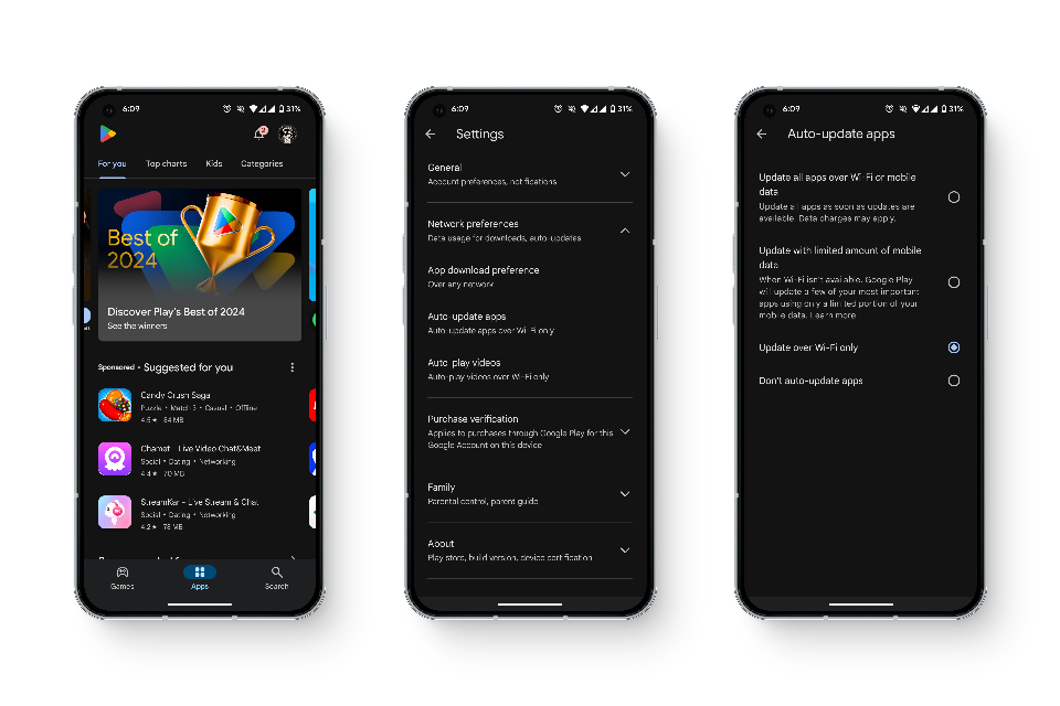 - اضغط على الإعدادات > تفضيلات الشبكة > تحديث التطبيقات تلقائيًا.