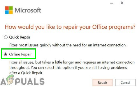 إذا لم ينجح ذلك، فمن المحتمل جدًا أنك تتعامل مع نوع من مشكلات التلف المحلي. إذا كان هذا السيناريو ينطبق، فيجب عليك محاولة إصلاح تثبيت Office الخاص بك باستخدام إجراء الإصلاح عبر الإنترنت (Online Repair).