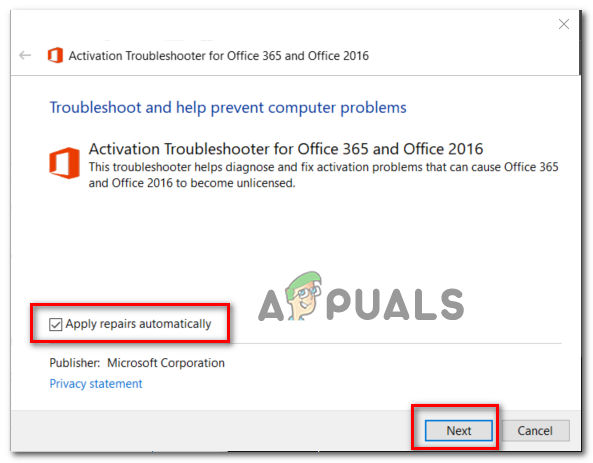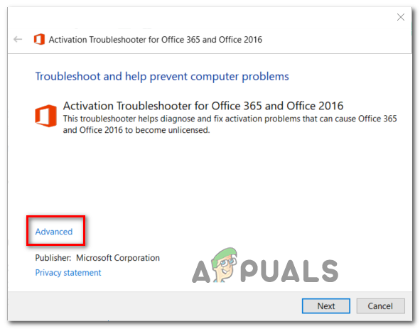 فيما يلي دليل خطوة بخطوة حول تشغيل مستكشف أخطاء التنشيط على حزمة Office المتأثرة لحل خطأ ‘Unlicensed Product’: