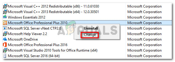 - داخل قائمة البرامج والميزات، قم بالتمرير لأسفل عبر قائمة التطبيقات المثبتة وحدد موقع تثبيت Office الذي تواجه مشكلات معه. بمجرد أن تراه، انقر بزر الماوس الأيمن على الإدراج المرتبط بـ Office واختر تغيير من قائمة السياق التي تظهر حديثًا.