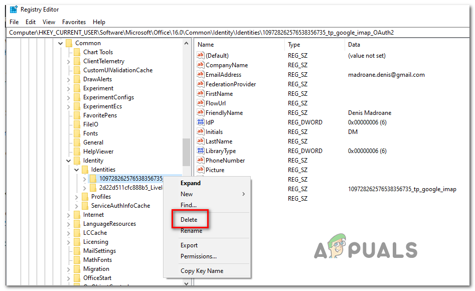 HKCUSoftwareMicrosoftOffice15.0 or 16.0CommonIdentityIdentities