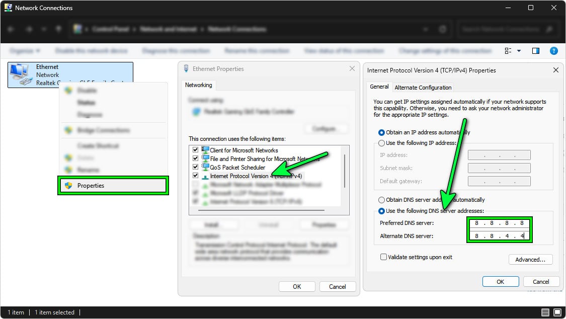 - اختر إصدار بروتوكول الإنترنت 4 (TCP/IPv4) ← ثم انقر على خصائص.