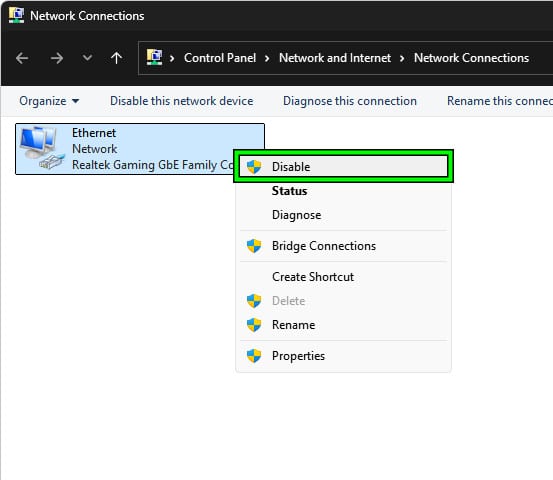 - انقر بزر الماوس الأيمن على اتصال الشبكة النشط لديك (Wi-Fi أو Ethernet) واختر تعطيل.