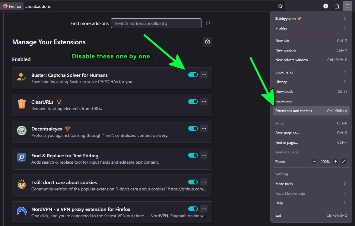 يمكن أن تتداخل بعض إضافات Firefox مع تحميل مواقع الويب أو حل نظام أسماء النطاقات (DNS). قد تحظر أدوات حظر الإعلانات، وأدوات الخصوصية، وإضافات VPN، أو مديري النصوص البرمجية عن غير قصد عناصر الموقع الأساسية، مما يؤدي إلى ظهور الخطأ.