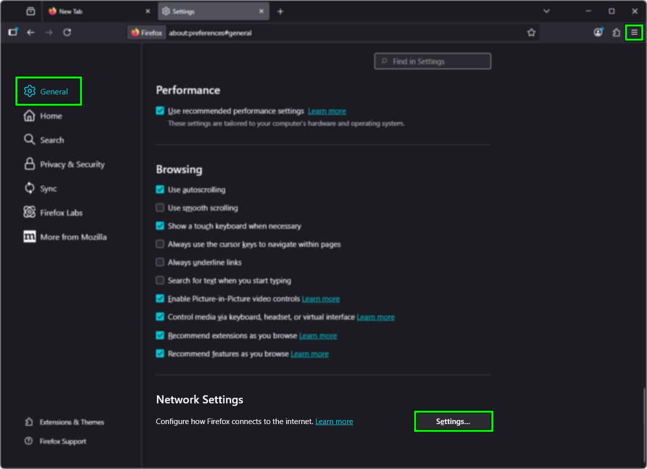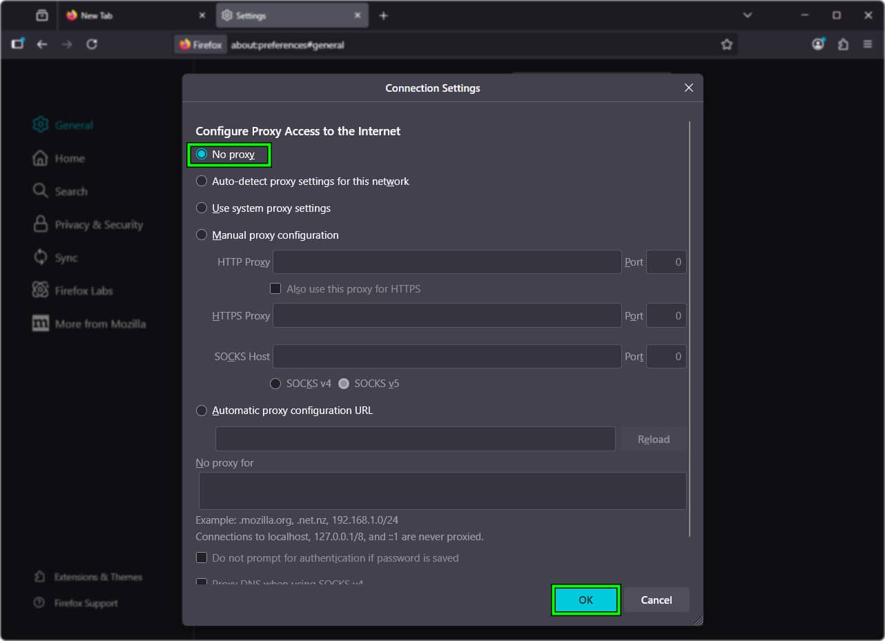 1. تعيين إعدادات اتصال Firefox على “بلا وكيل” (No proxy)