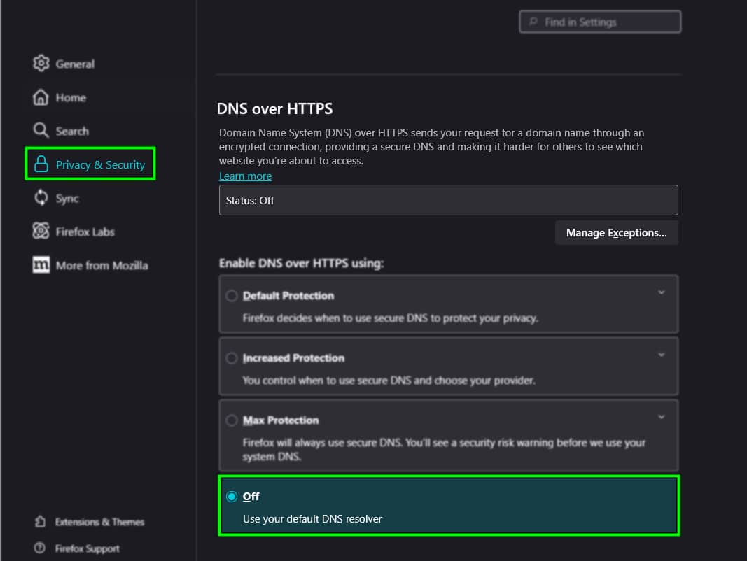 يتضمن Firefox ميزة تسمى DNS عبر HTTPS (DoH) التي تقوم بتشفير طلبات DNS الخاصة بك لخصوصية أفضل. ومع ذلك، قد تحظر بعض مزودي خدمة الإنترنت والشبكات حركة مرور DNS المشفرة، مما قد يتسبب في ظهور خطأ “نواجه مشكلة في العثور على هذا الموقع”.