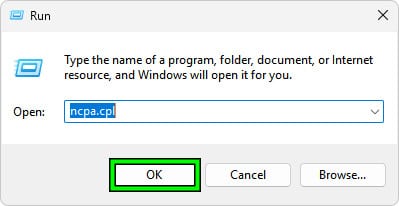 ncpa.cpl، واضغط على Enter.