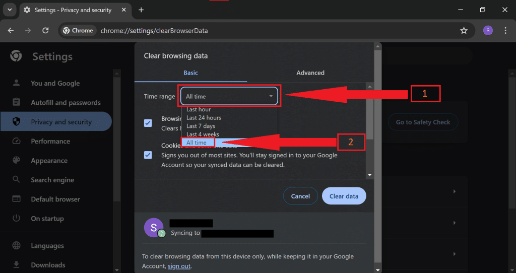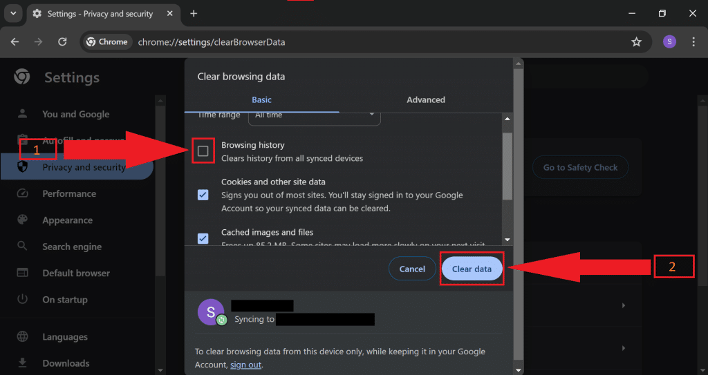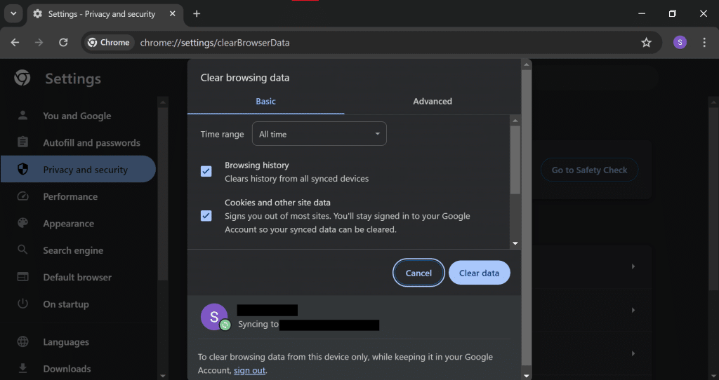 2. حذف ملفات تعريف الارتباط وذاكرة التخزين المؤقت لمتصفحك