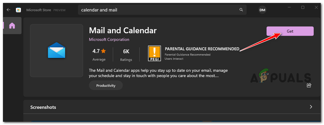 - حدد تطبيق البريد والتقويم من قائمة النتائج، ثم حدد زر الحصول.