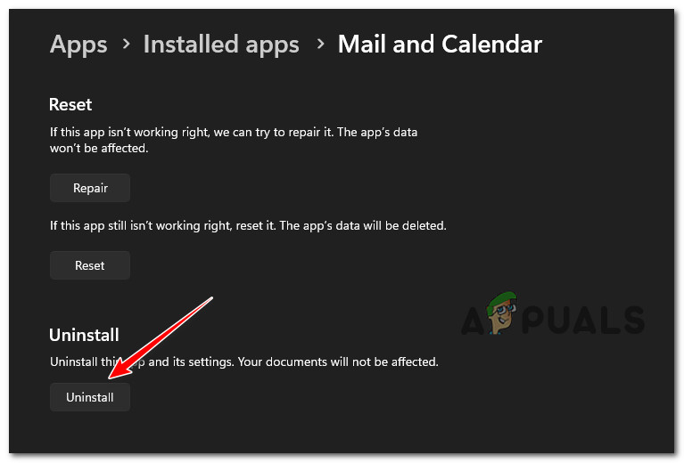 - انتقل إلى علامة التبويب إلغاء التثبيت وانقر فوق الزر إلغاء التثبيت بعد فتح قوائم الخيارات المتقدمة الخاصة ببرنامجي البريد والتقويم.