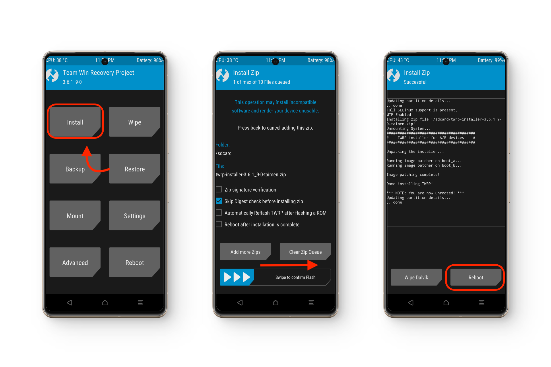 - في TWRP، اضغط على Install > اسحب للتأكيد على التفليش > Reboot.