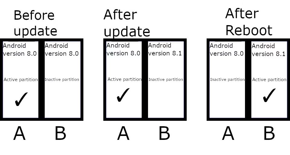بالنسبة للأجهزة التي تدعم تقسيمات A/B أو “التحديثات السلسة“، فإنها تعمل بطريقة حيث يقيم نظام التشغيل في فتحة واحدة بينما يتم تثبيت أي تحديث جديد في الفتحة الأخرى (غير النشطة). بمجرد تثبيت التحديث بنجاح، يقوم الهاتف بالتمهيد إلى التقسيم الآخر ويحدده كتقسيم نشط. ومع ذلك، إذا فشل التحديث، فإن الهاتف لا يقوم بالتمهيد إلى الفتحة الأخرى على الإطلاق.