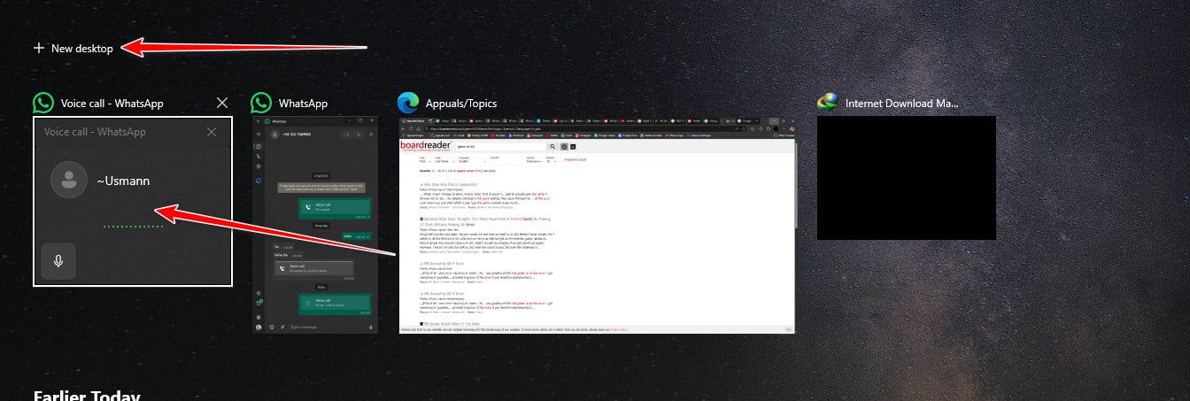 اضغط على Windows + Tab واسحب النافذة المنبثقة لمكالمة WhatsApp إلى سطح مكتب جديد.