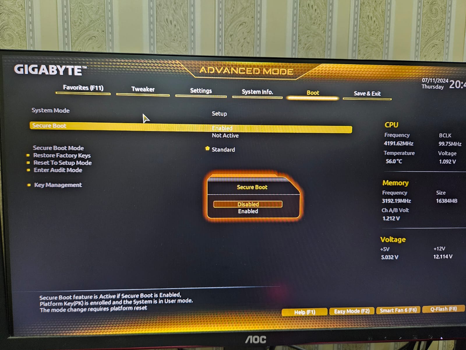 - انتقل إلى قسم “Boot”، وابحث عن “Secure Boot” واضبطه على “Disabled”.