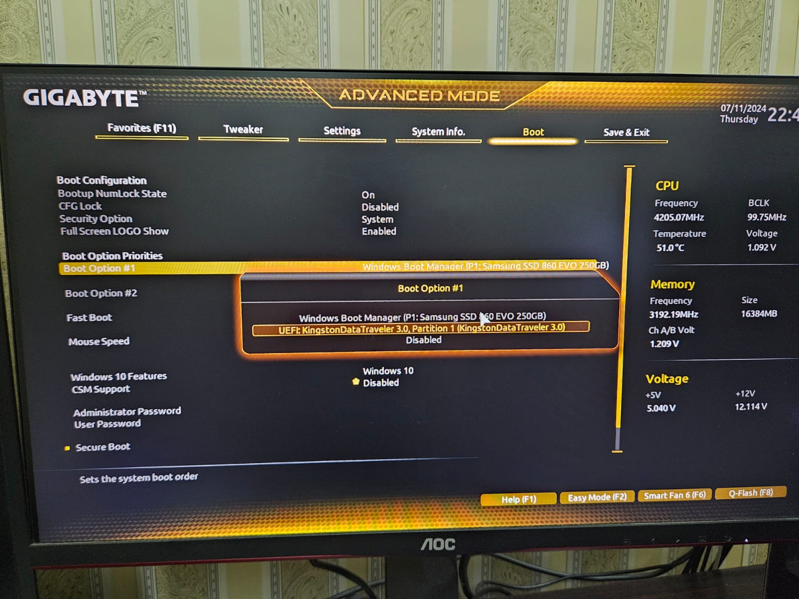 - افتح BIOS/UEFI الخاص بنظامك بالضغط على مفاتيح “Delete” أو “F1” أو “F2” أو “F10”. بمجرد فتحه، انتقل إلى قسم “Boot” أو ما يشبهه. في Boot Priorities أو Boot Option#1، اضبطه على محرك أقراص USB المتصل لديك.
