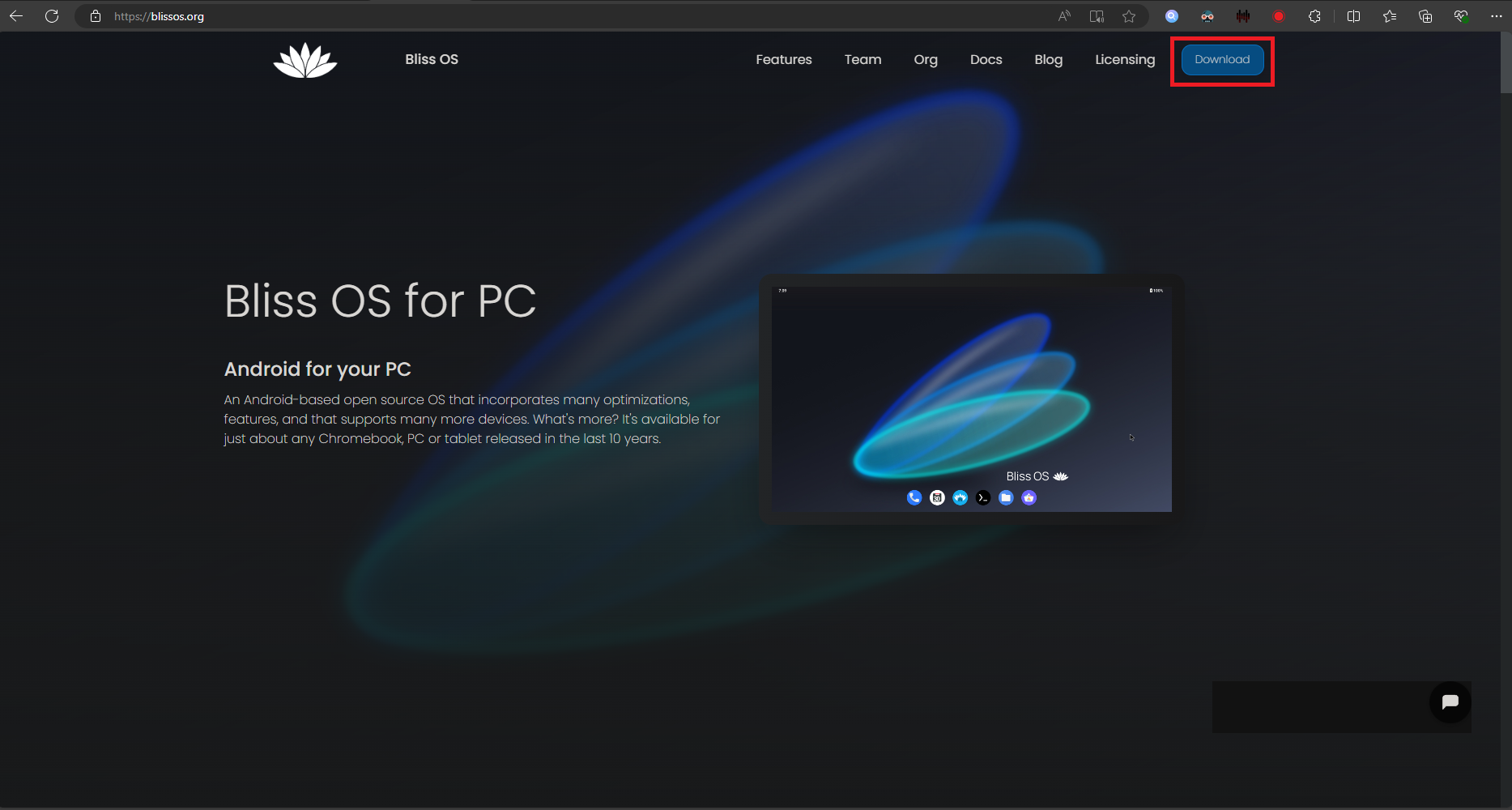 - لتنزيل الإصدار المناسب من BlissOS، قم بزيارة موقعهم الإلكتروني باستخدام الرابط التالي. يرجى التحقق جيدًا من عنوان URL؛ “https://blissos.org“. انقر على زر “Download” (تنزيل) في الزاوية العلوية اليمنى من الصفحة.