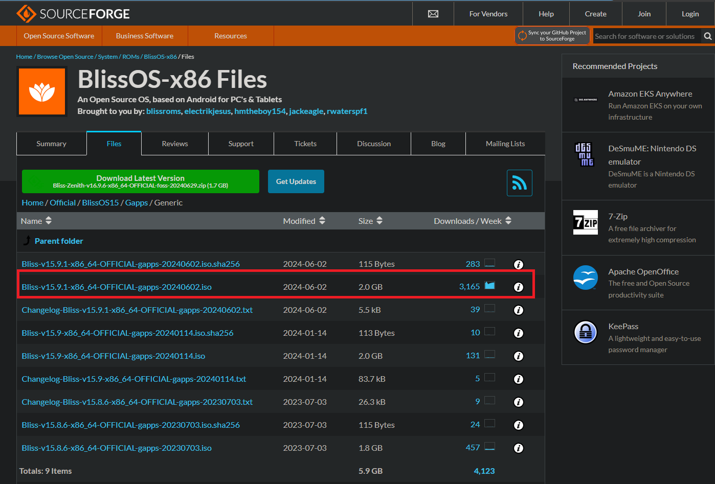 - بمجرد فتح SourceForge، حدد أحدث إصدار، والذي يشار إليه بعدد “عمليات التنزيل/الأسبوع“. سنقوم بتنزيل الإصدار “Bliss-v15.9.1“. انقر على الرابط المميز، وسيبدأ تنزيل ملف .iso.