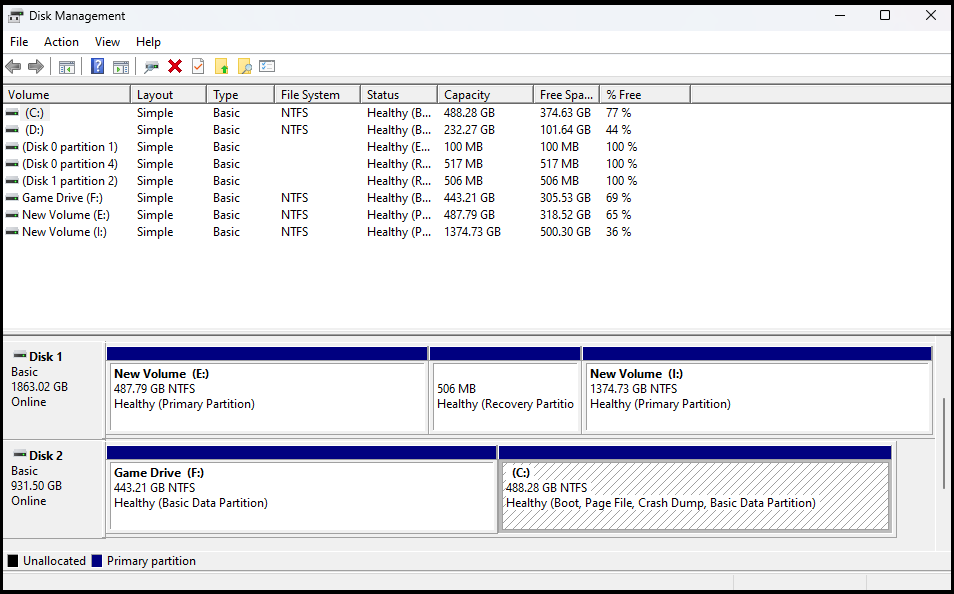 - انقر على الخيار المحدد، وستُفتح أداة “Disk Management” التي توفر لك نظرة عامة على أجهزة التخزين المثبتة والأقسام الخاصة بها.