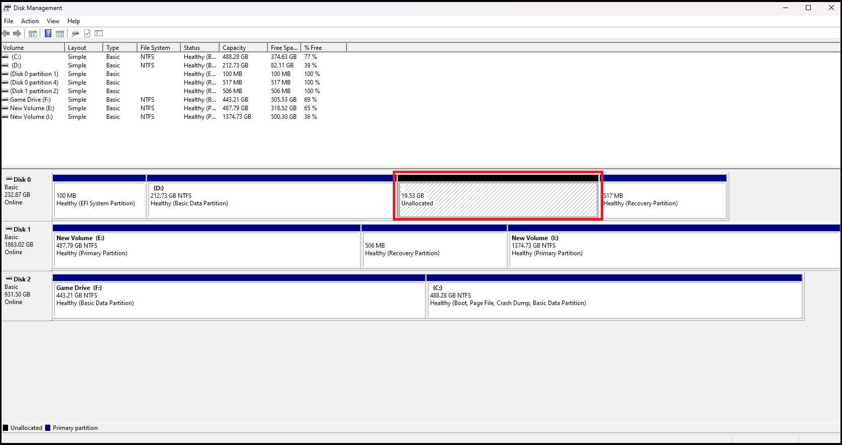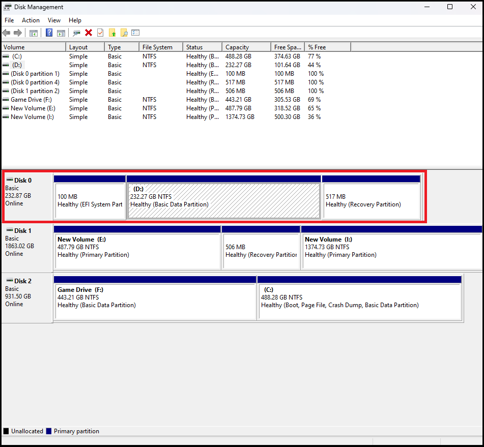 ![لقطة شاشة لإدارة الأقراص مع تحديد القرص 0]()