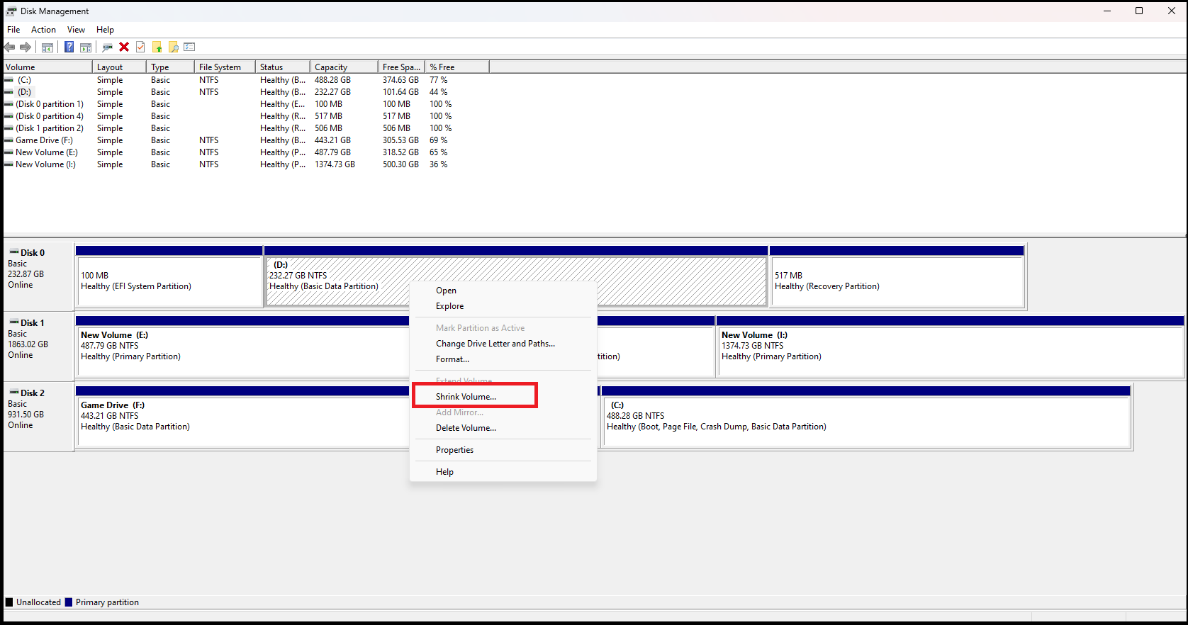 ![لقطة شاشة لإدارة الأقراص تعرض قائمة النقر بزر الماوس الأيمن مع خيار تقليص وحدة التخزين]()