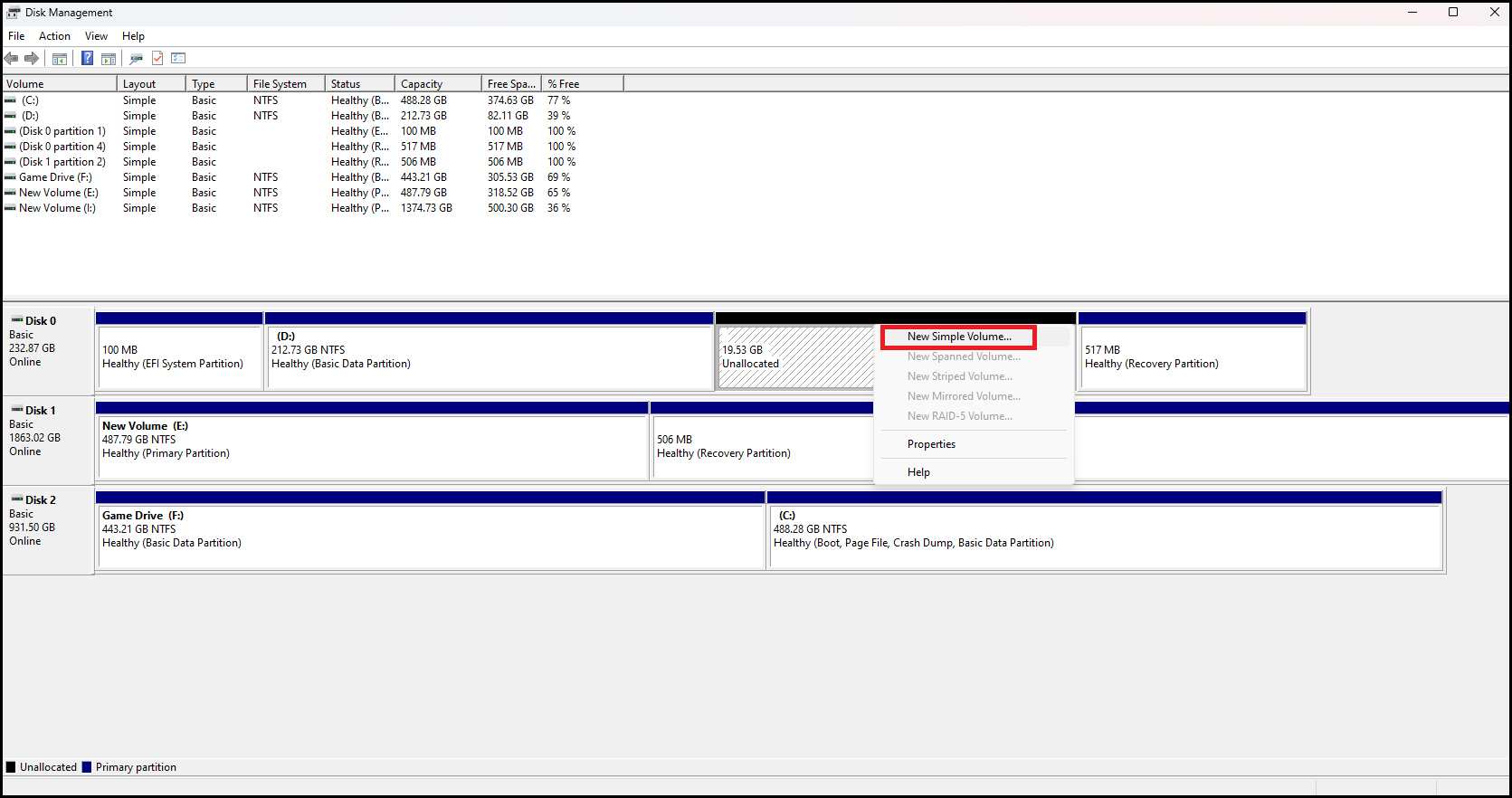 - الخطوة التالية هي تهيئة هذا القسم الجديد بصيغة “NTFS“. للقيام بذلك، انقر بزر الماوس الأيمن على القسم الجديد غير المخصص، وانقر على “New Simple Volume“.