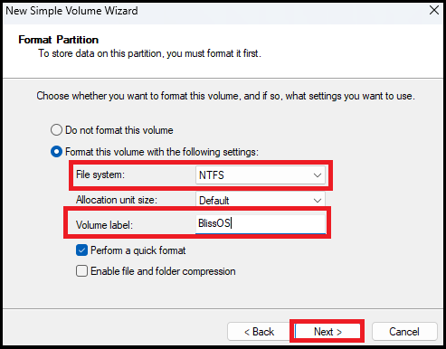 - اتبع المعالج حسب المطلوب بالضغط على “Next“، في صفحة “Specify Volume Size“، اترك الإعدادات الافتراضية، وفي صفحة “Assign Drive Letter or Path“، اختر حرفًا من اختيارك، وفي صفحة “Format Partition“، حدد نوع نظام الملفات “NTFS“. يمكنك اختيار Volume label من اختيارك.