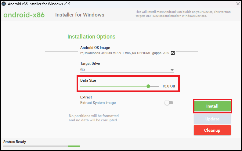 - زد “Data Size” إلى حوالي 15–16GB وانقر على “Install“. انتظر حتى يتم تثبيت BlissOS.