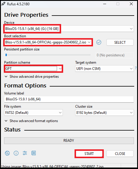 - انقر على “START” وانتظر حتى يتم نسخ الصورة إلى محرك أقراص USB المحمول الخاص بك.