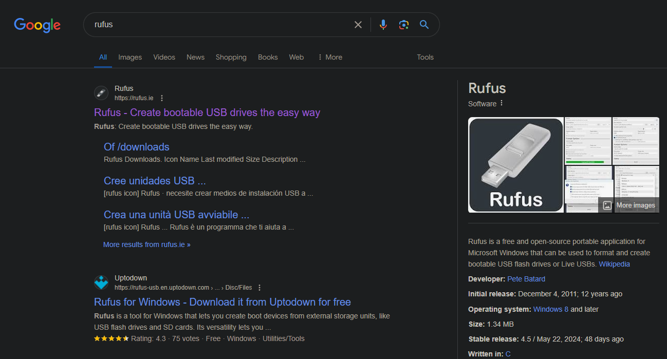 - اكتب “Rufus” في Google وافتح الرابط الأول. يمكنك أيضًا استخدام الرابط المتوفر. تحقق جيدًا من عنوان URL؛ “https://rufus.ie/en/“.