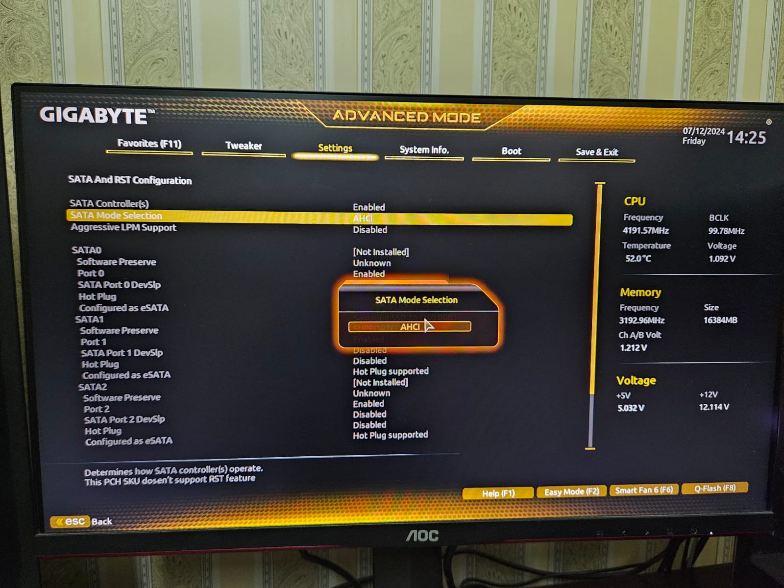 - بعد ذلك، ستحتاج إلى العثور على إعداد SATA Controller الذي يتواجد عادةً في تبويب “Settings”. اضبط وضع الـ SATA على “AHCI” بدلاً من IDE/RAID.