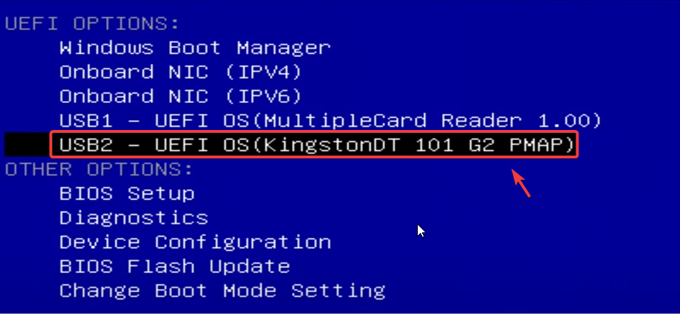 - من قائمة الإقلاع، اختر محرك الـ USB للإقلاع منه.