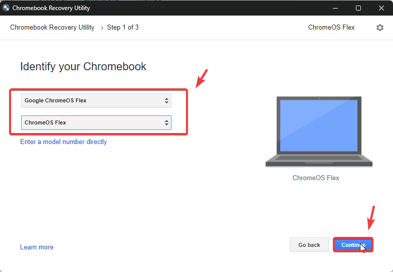 - بعد الانتهاء، انقر على Continue لتنزيل وتثبيت Chrome OS Flex.
