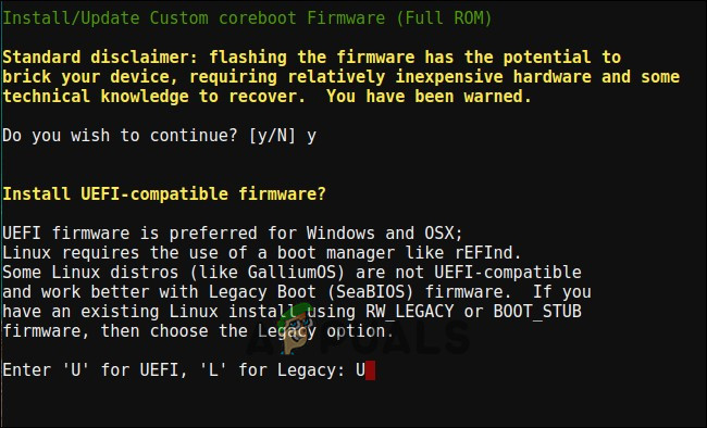 - أدخل “Y” للموافقة على تحديث (فلاش) البرامج الثابتة (firmware) الخاصة بك، ثم أدخل “U” لتثبيت برامج ثابتة UEFI. إذا اخترت خيار “Legacy”، فلن تتمكن من تشغيل Windows.