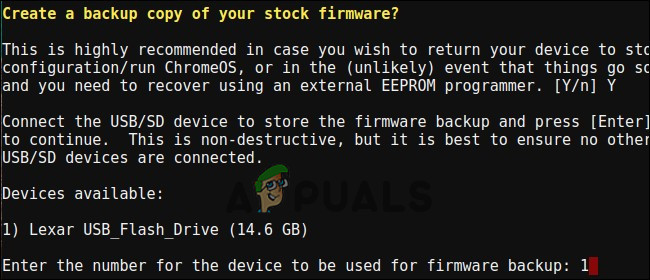 - سيقدم السكريبت خيار إنشاء نسخة احتياطية من BIOS الأصلي لجهاز Chromebook ونسخها على محرك أقراص USB لك. يجب عليك إنشاء هذه النسخة الاحتياطية وتخزينها في مكان آمن في حال رغبت في استعادة BIOS الأصلي لجهاز Chromebook في المستقبل.