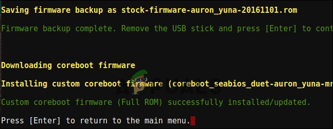 - بعد اكتمال عملية النسخ الاحتياطي، سيقوم السكريبت بتنزيل واستبدال البرامج الثابتة (firmware) من نوع Coreboot على جهاز Chromebook الخاص بك. أوقف تشغيل Chromebook عندما ينتهي.