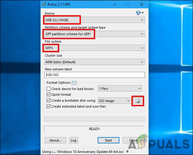 - افتح Rufus، حدد محرك أقراص USB الخاص بك، & حدد “GPT partition scheme for UEFI” و “NTFS“. انقر على الزر الموجود على يمين “إنشاء قرص قابل للتمهيد باستخدام” وحدد صورة ISO لـ Windows 10 التي قمت بتنزيلها.