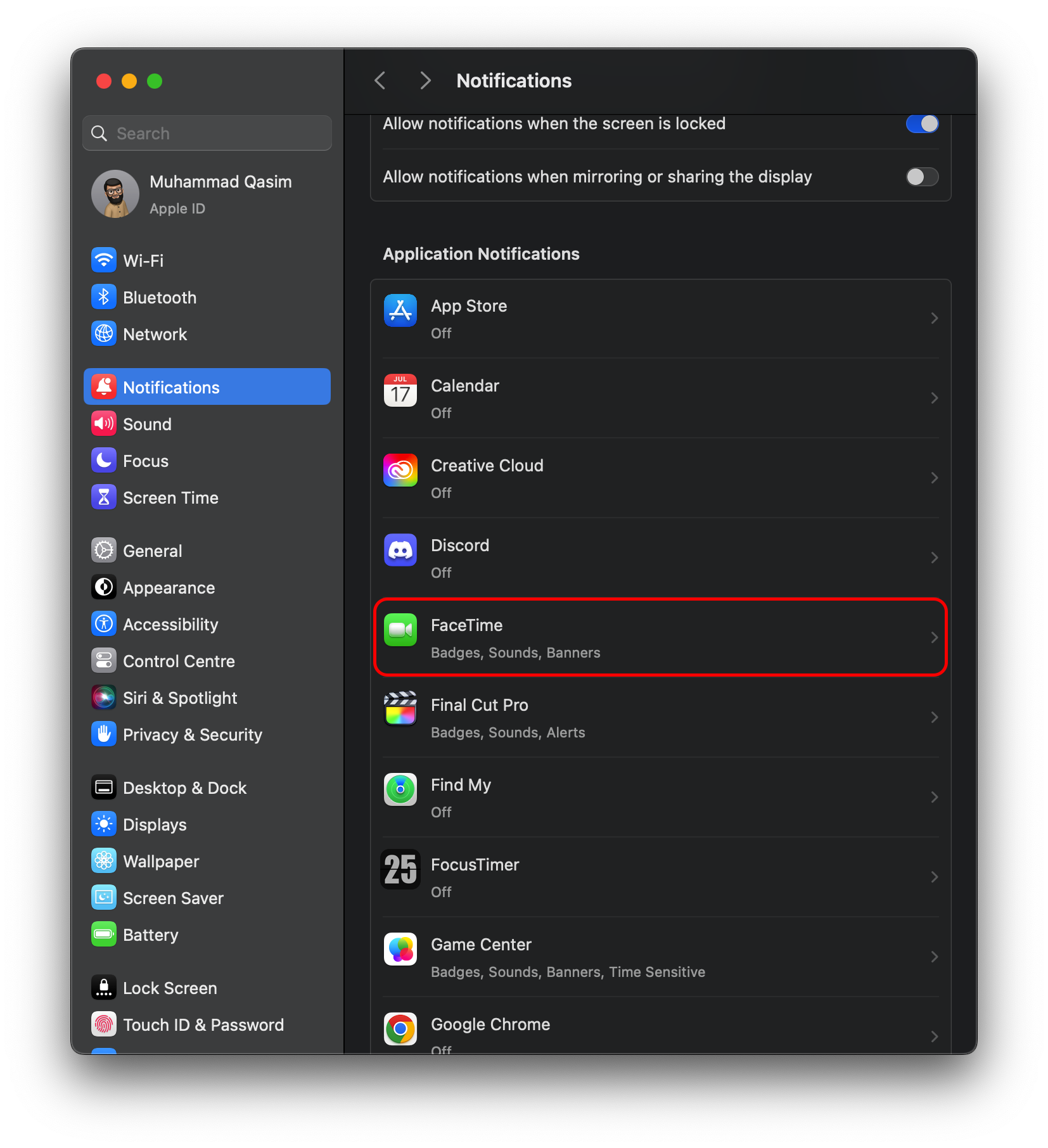 3. حدد FaceTime وقم بإيقاف تشغيل “السماح بالإشعارات“.