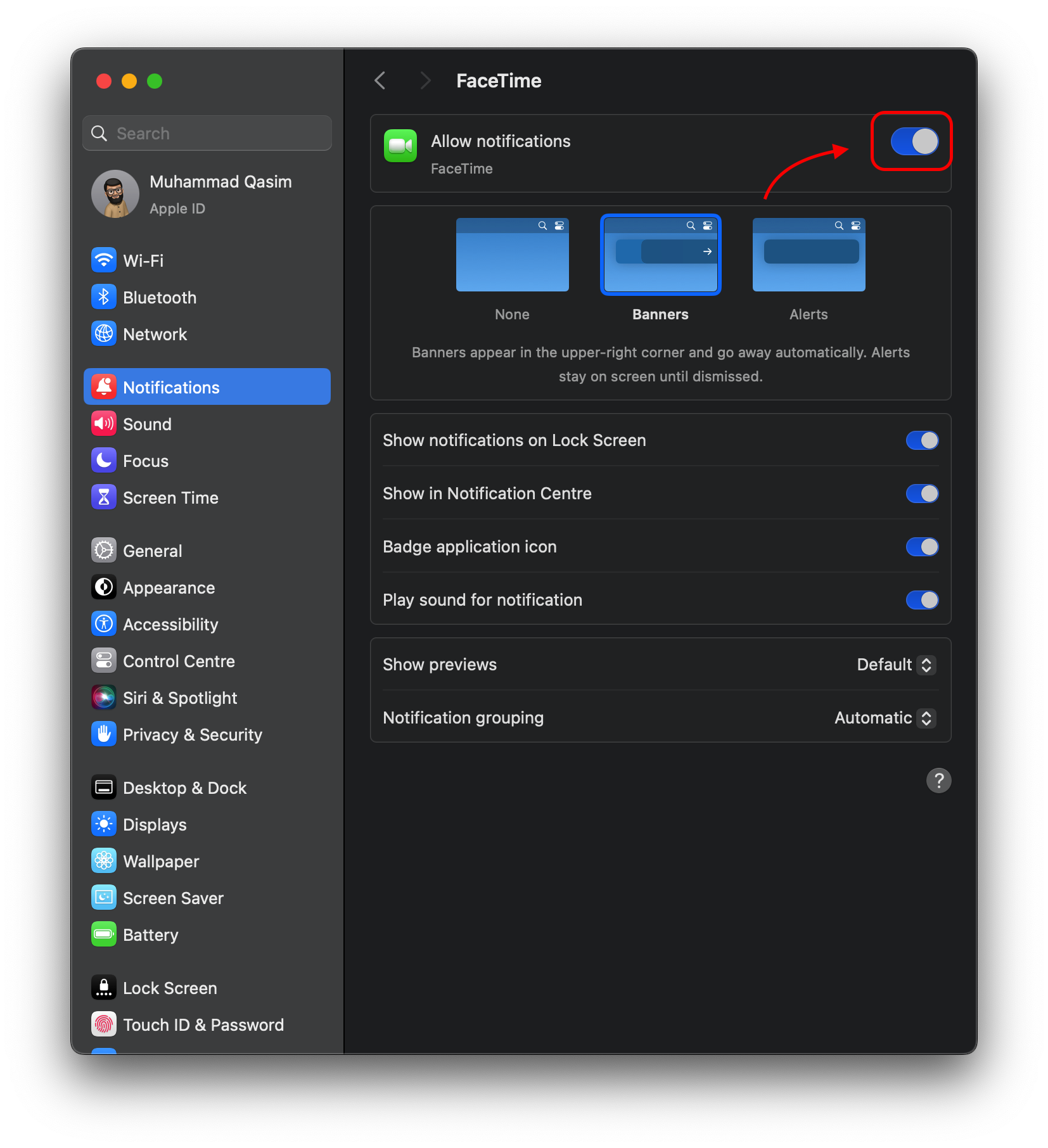 سيؤدي تعطيل الإشعارات لتطبيق FaceTime إلى منع جهاز MacBook الخاص بك بشكل فعال من الرنين أو عرض التنبيهات عند تلقي مكالمات محولة من iPhone الخاص بك.