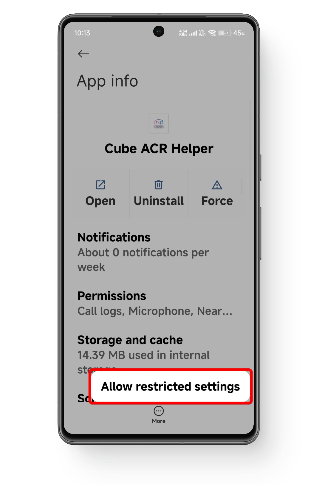 - قم بتمكين الخيار المسمى Allow restricted settings بالضغط عليه وتأكيد أي مطالبات أخرى بالضغط على موافق.