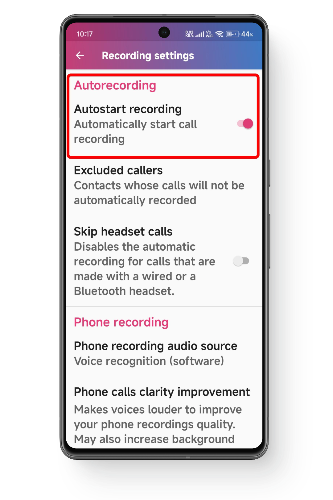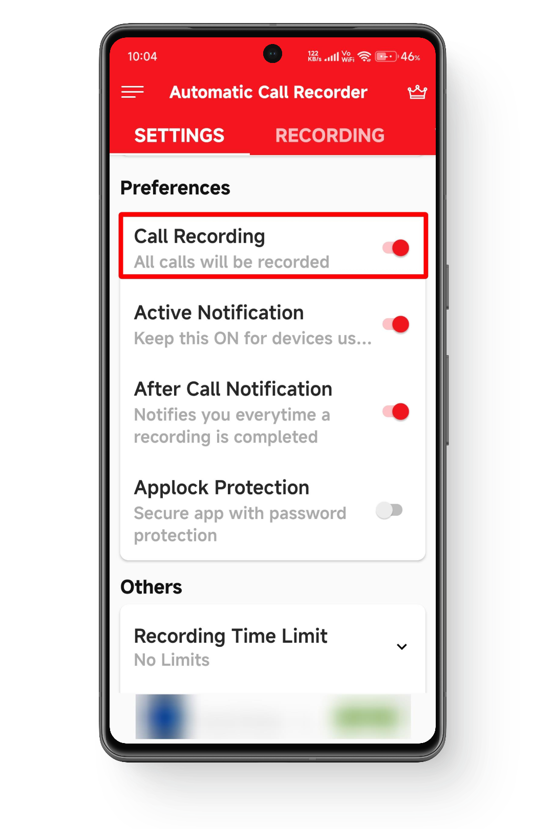 - انتقل إلى الإعدادات وقم بتمكين تسجيل المكالمات للمكالمات الواردة والصادرة.