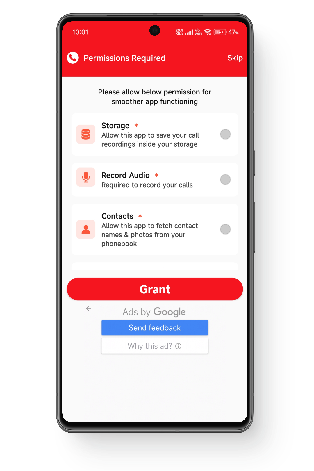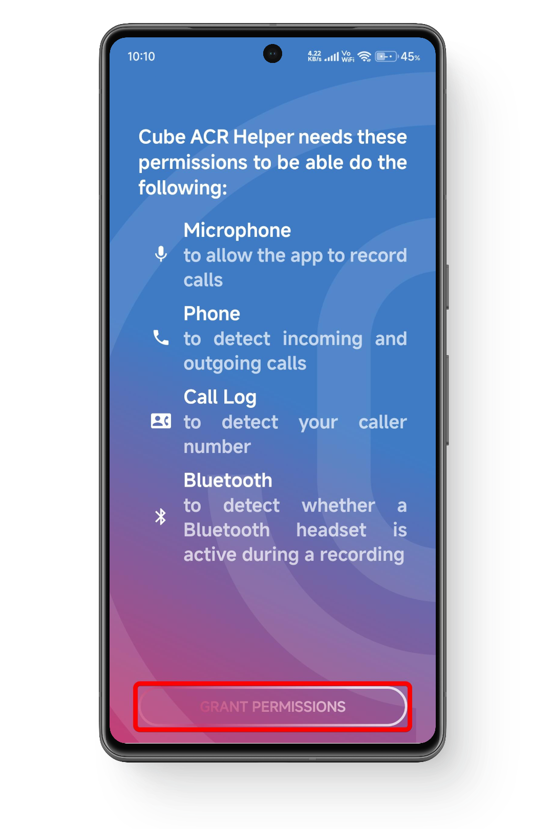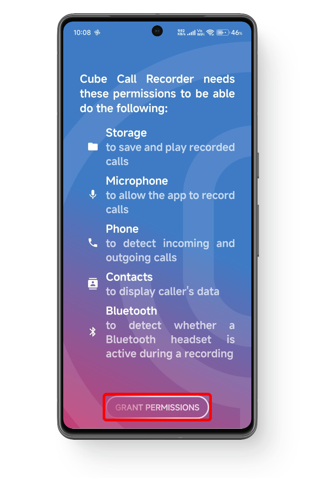 - قم بتشغيل التطبيق وامنحه حق الوصول إلى جهات الاتصال والميكروفون لتمكين تسجيل المكالمات.