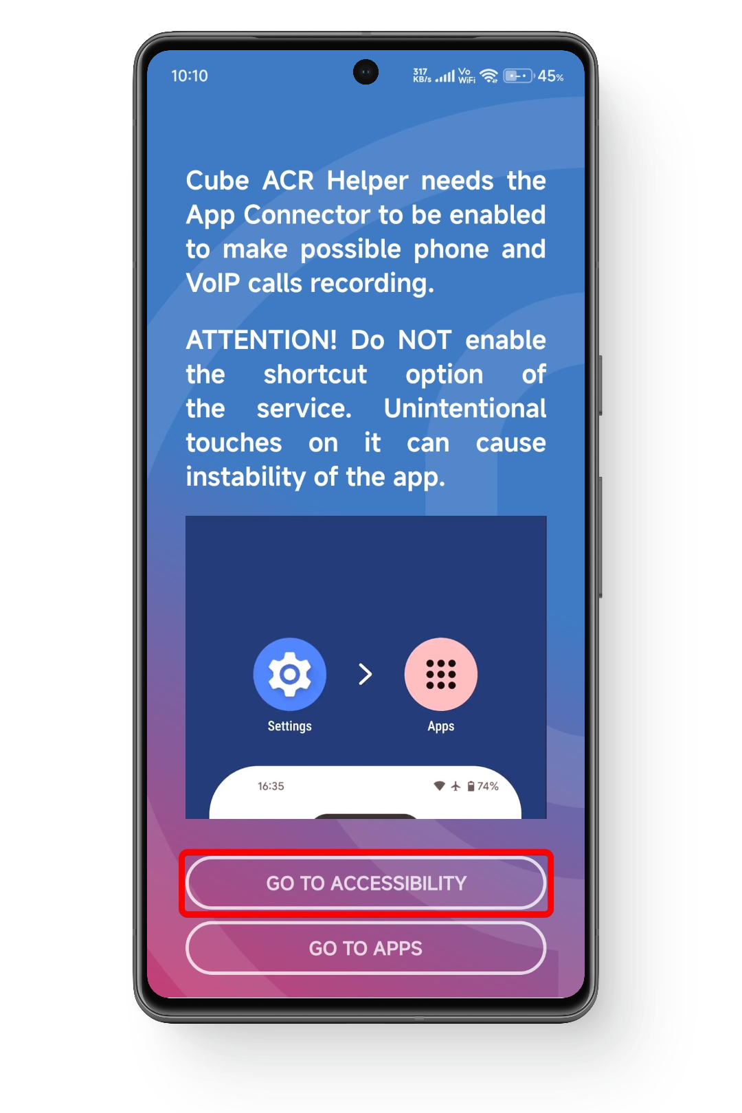 - ارجع إلى تطبيق Cube ACR Helper واضغط على Go to Accessibility.