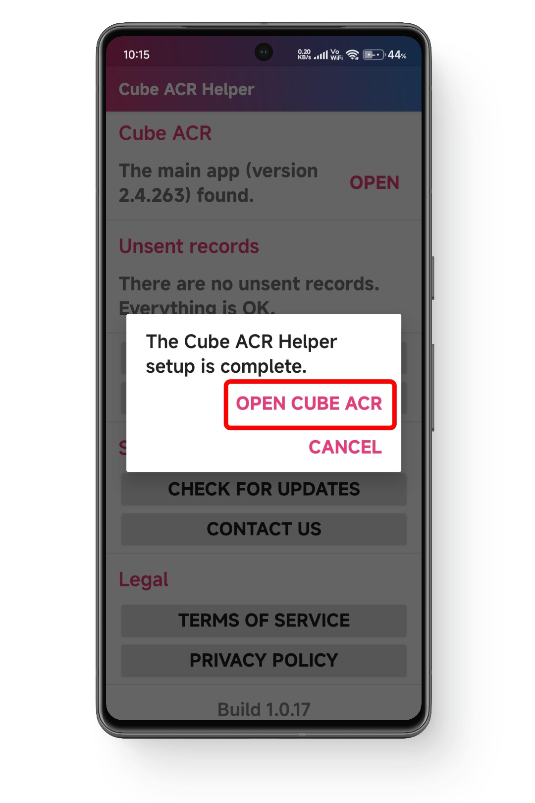 - ارجع إلى Cube ACR Helper. اكتمل الإعداد الآن، والتطبيقان متصلان. اضغط على Open Cube ACR.