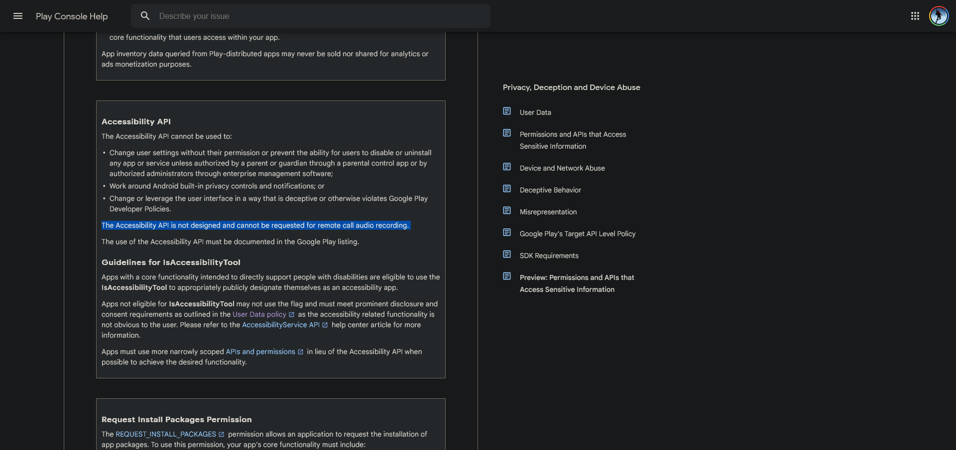 - اعتبارًا من 11 مايو 2022، طبقت Google تغييرًا كبيرًا في سياستها يحظر على تطبيقات تسجيل المكالمات التابعة لجهات خارجية استخدام واجهة برمجة تطبيقات الوصول (Accessibility API) لتسجيل المكالمات. اتُخذ هذا القرار لسد الثغرات التي سمحت للمطورين باستغلال هذه الميزة لأغراض غير مصرح بها. واجهة برمجة تطبيقات الوصول (Accessibility API) مخصصة للتطبيقات التي تساعد المستخدمين ذوي الإعاقة، وليست لتسجيل المكالمات.