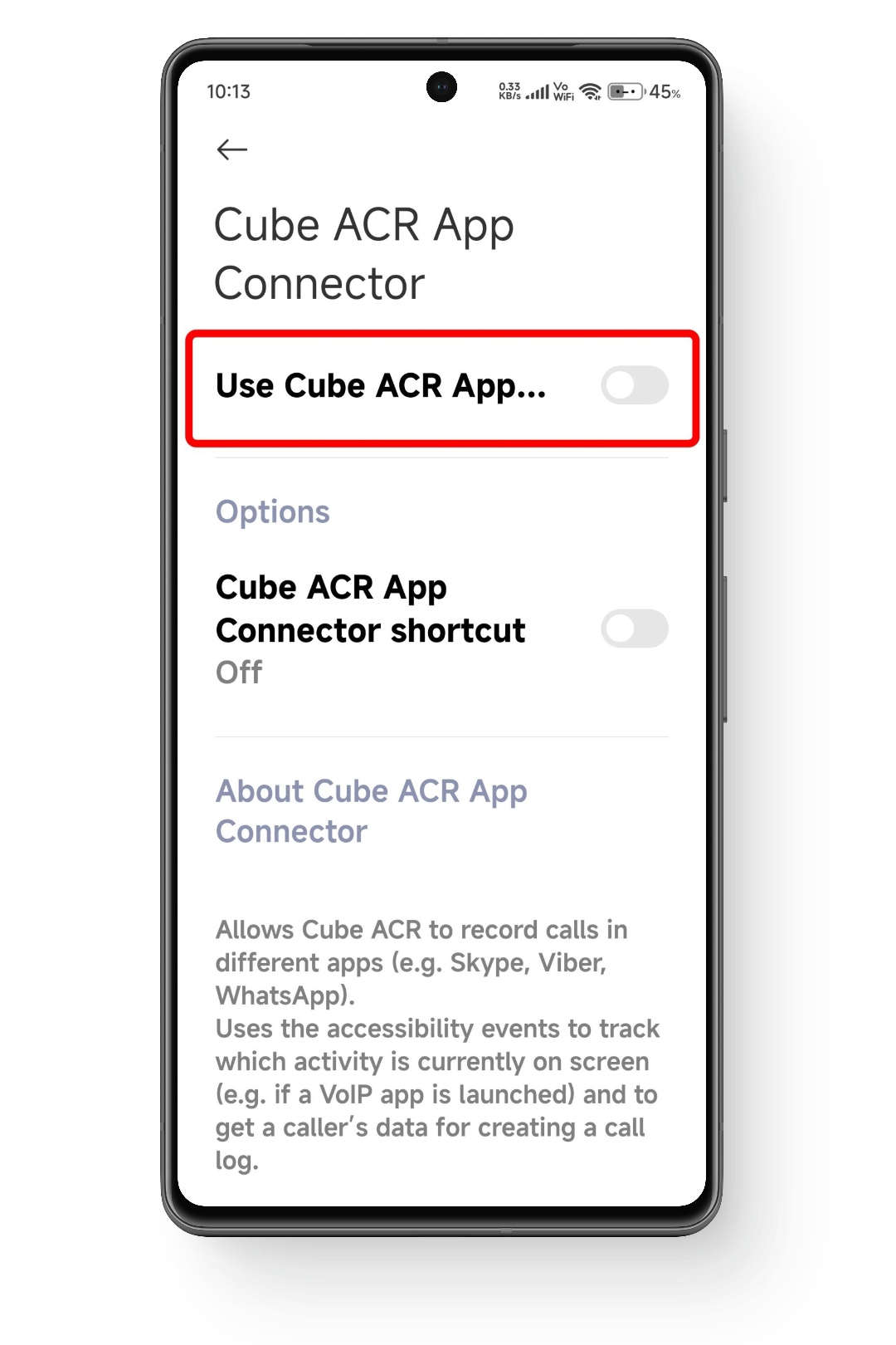 - قم بتبديل الخيار المسمى Use Cube ACR app connector إلى On لتمكين التكامل لتسجيل المكالمات.