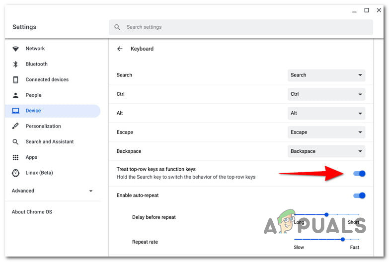 هام: قد لا تتمكن من استخدام هذا الاختصار إذا كانت ميزة مفتاح الوظائف معطلة في إعدادات Chrome OS الخاصة بك. لإصلاح هذه المشكلة، اتبع التعليمات أدناه:
